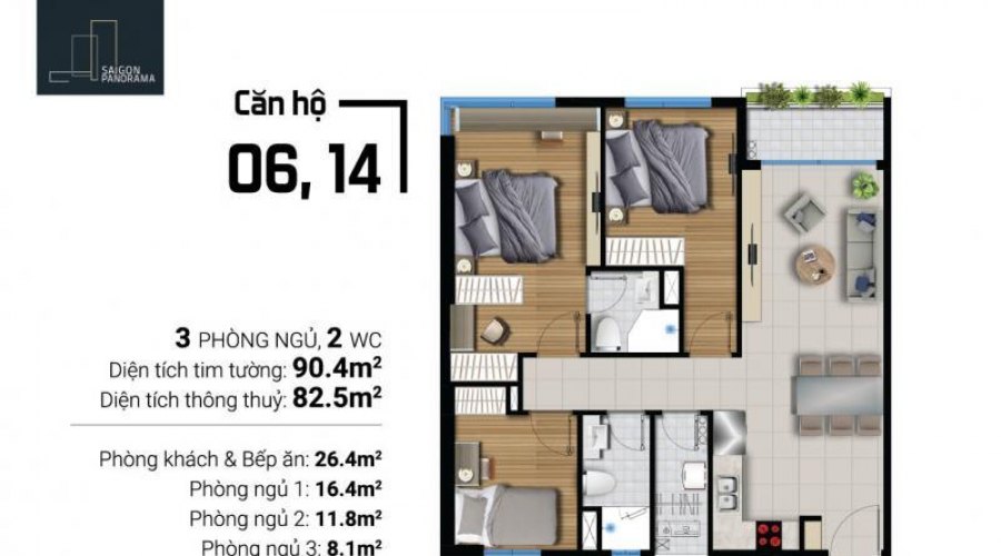- Loại căn hộ 3PN, 2WC: 90.4m2, 113.9m2